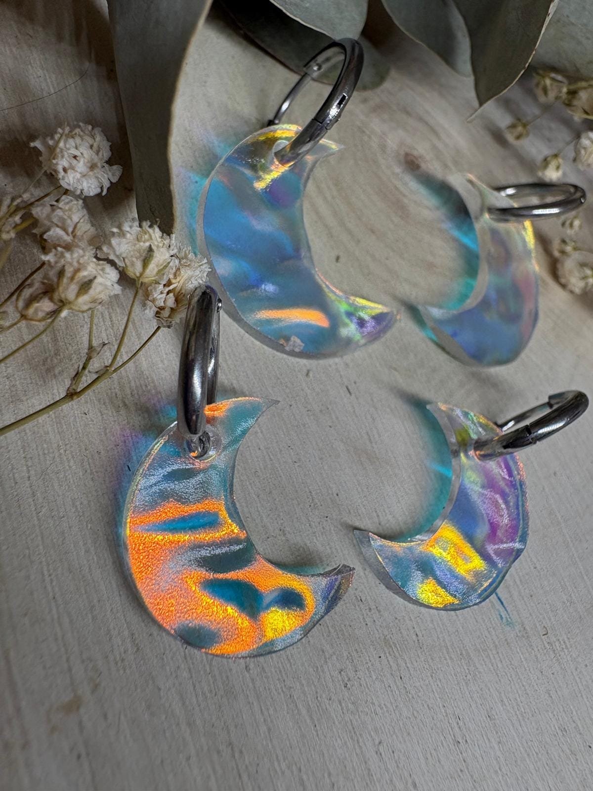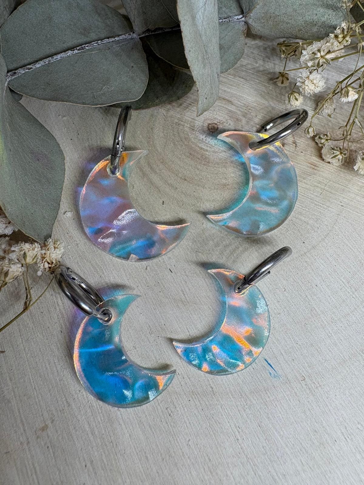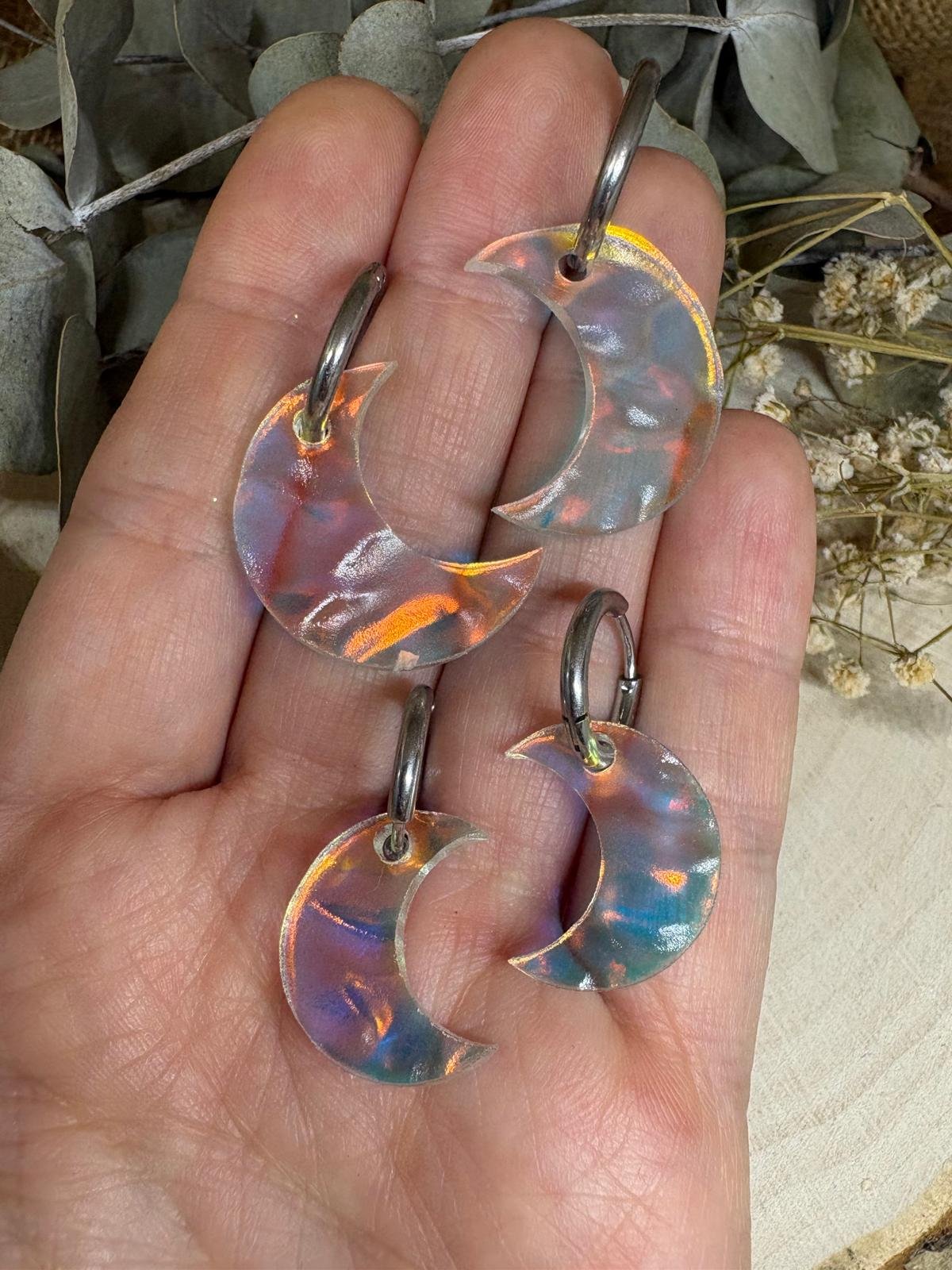 Cada luna está realizada en metacrilato iridiscente de última generación, con una textura sutil que aporta profundidad y reflejos únicos en tonos nacarados, azules, rosados y dorados. No hay dos iguales: cada pieza tiene su propio juego de luces.
